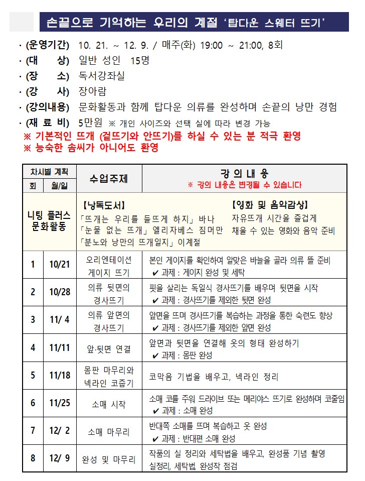 제목 | [일반인강좌] (안산 문화학교) 손끝으로 기억하는 우리의 계절 '탑다운 스웨터 뜨기' | ||