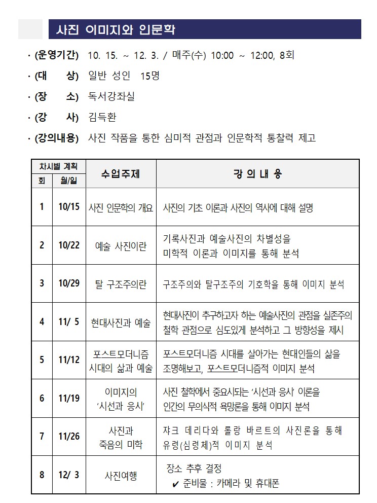 제목 | [일반인강좌] (안산 문화학교) 사진 이미지와 인문학 | ||