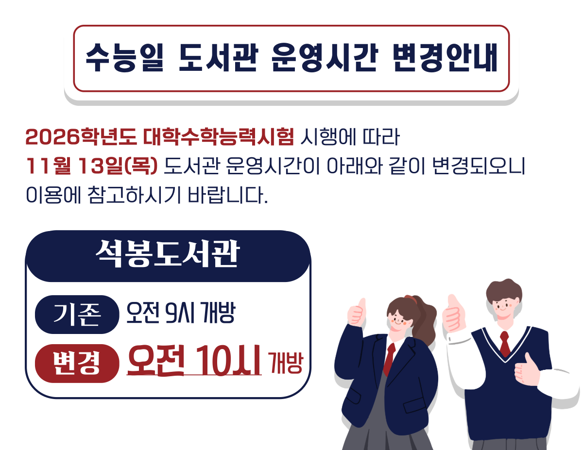 Home 참여광장 공지사항 공지사항 이 게시물은 비공개 입니다. 게시물 등록시 사용했던 비밀번호를 입력하세요. 확인 닫기 공지사항 상세화면 - 제목,작성자,등록일,조회수,첨부파일을 제공하는 표 제목 2026학년도 대학수학능력 시험일 11.13.(목) 도서관 운영시간 안내 작성자 석봉도서관 등록일 2025-11-11 조회수 54 첨부파일 목록
