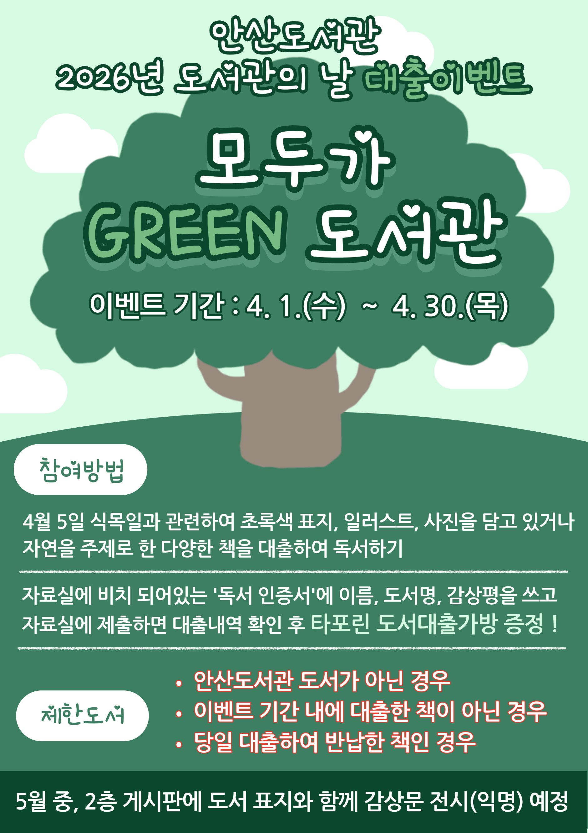 안녕하세요. 안산도서관 입니다. 다가오는 4월 1일(수)부터 4월 30일(목)까지 4월 도서관의 날을 기념하여 안산도서관 종합자료실에서 대출 이벤트를 진행할 예정입니다. 자세한 사항은 아래 포스터를 참고해주시고, 문의는 종합자료실(608-5554, 5557)로 부탁드립니다. 많은 관심과 참여 부탁드립니다. 감사합니다. - 운영기간: 26. 4. 1.(수) ~ 4. 30.(목) - 운영장소: 안산도서관 종합자료실 - 운영내용: 종합자료실 4월 북큐레이션 '우리가 GREEN 도서관'과 연계하여 초록색 표지, 일러스트, 사진을 담고 있거나 자연을 주제로 한 책을 대출 후, 자료실에 비치된 '독서 인증서'에 감상평을 써서 제출하면 도서대출가방 증정 모든 장르의 도서(철학, 경제, 소설, 과학, 역사 등)로 신청가능 ※제한도서: 안산도서관 도서가 아닌 경우, 이벤트 기간 내에 대출한 도서가 아닌 경우, 당일 대출하여 반납한 책인 경우 - 비고: 5월 중, 도서관 2층 게시판에 도서 표지와 함께 감상문을 익명으로 편집하여 전시할 예정