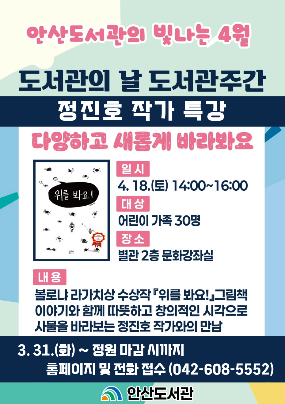 | 제목 | [안산도서관] 도서관의 날· 도서관 주간 <정진호 작가 특강> 모집 안내 | ||||