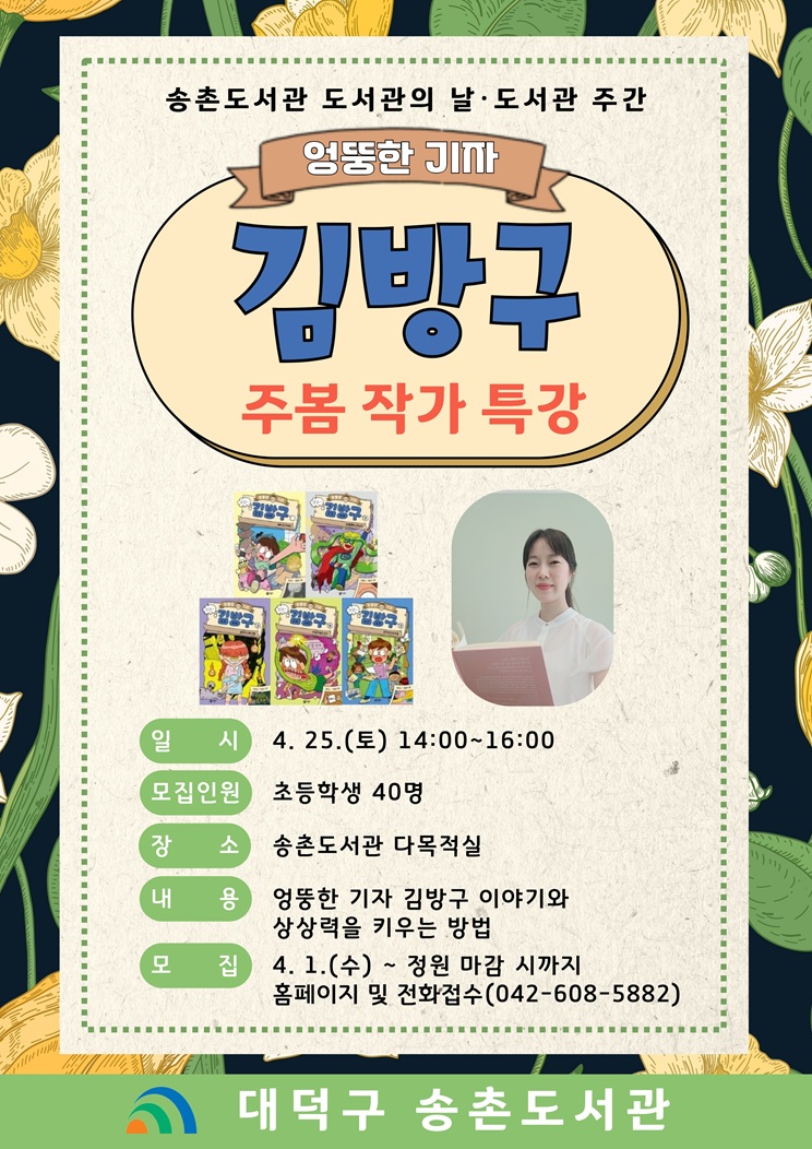 『엉뚱한 기자 김방구』 시리즈 주봄 작가 특강 4월 25일(토) 오후 2시 송촌도서관 다목적실에서 진행합니다. 『엉뚱한 기자 김방구』 시리즈 이야기를 나누고, 엉뚱하고 신나는 상상력을 키워보는 시간! 많은 신청 바랍니다^^ 모집 : 4월 1일(수) 오전 9시 부터, 홈페이지 및 전화(042-608-5882) 동시 접수