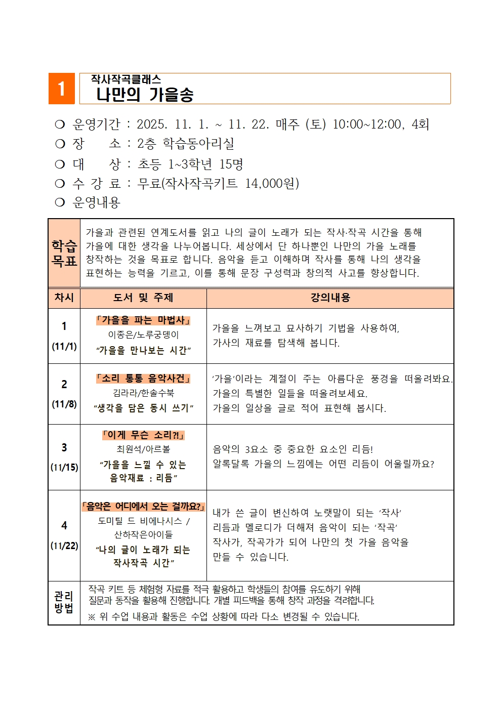 제목 | [어린이강좌] [송촌] 작사작곡클래스 <나만의 가을송> 모집(초1-3) | ||